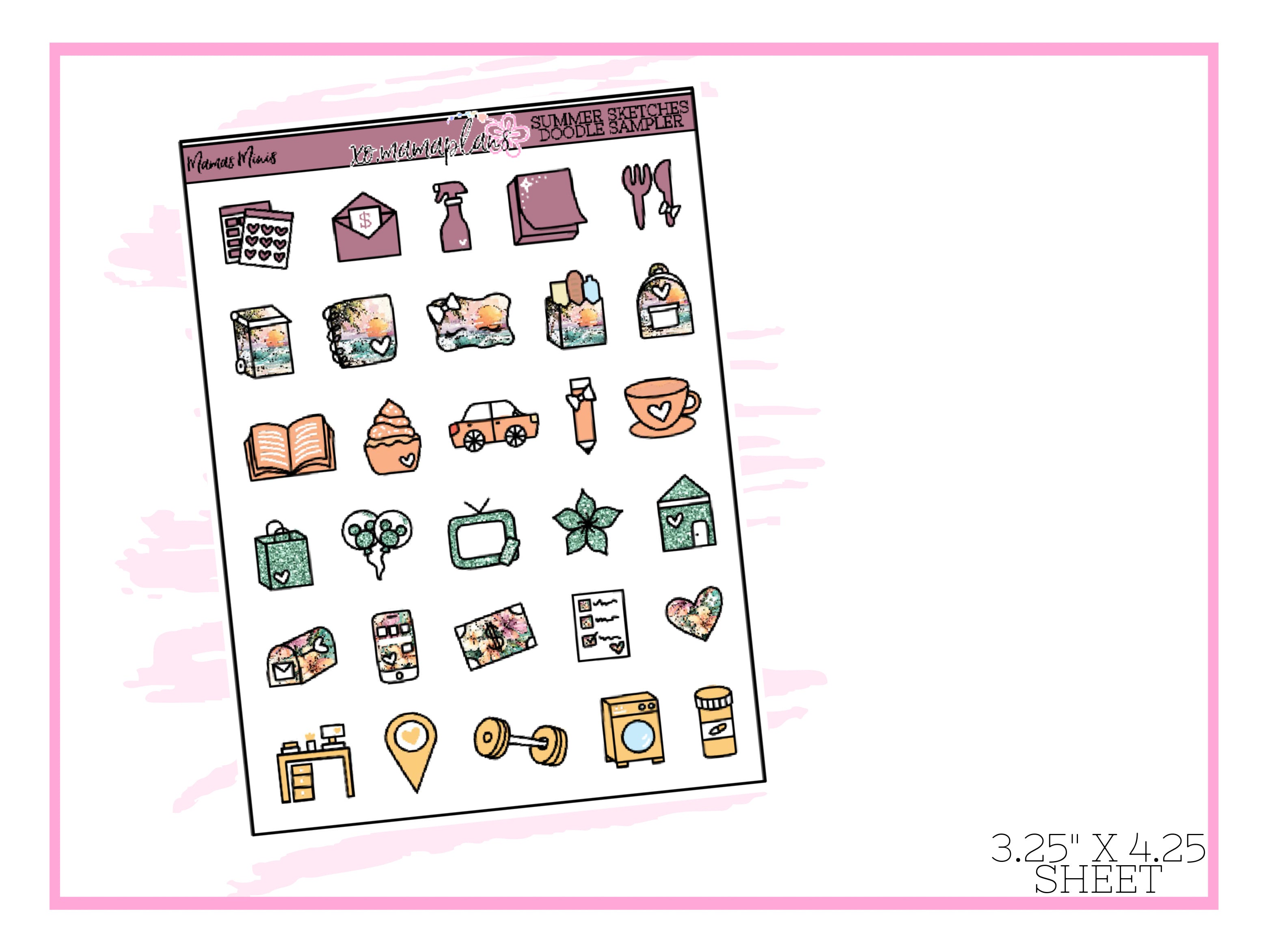 Summer Sketches Sampler StickersMatches the Summer Sketches CollectionA mini sheet perfect to slip into your planner pocket.Variety of colors to match many spreads.Sticker sheet is approx. 3."1 x 4.2"